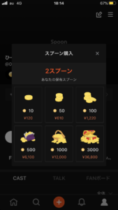 投げ銭をするには、まずスプーンを購入する必要があります。